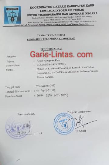 Kaur. Lembaga masyarakat di Kabupaten Kaur mempertanyakan laporan yang masuk ke Kejaksaan Negeri (Kejari) Kaur terkait dugaan penyalahgunaan anggaran di Dinas Komunikasi dan Informatika (Kominfo) Kaur. Laporan tersebut mencakup tahun anggaran 2022-2024 dan dikabarkan terkait penggunaan dana untuk program internet. Lembaga masyarakat berharap agar Kejari Kaur dapat mengusut tuntas kasus ini.
