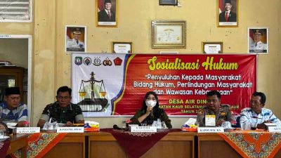 Sosialisasi tersebut menghadirkan narasumber dari unsur aparat keamanan, yakni Kapolsek Kaur Selatan dan Danramil 408-04. Kehadiran kedua pemateri ini bertujuan untuk memberikan pemahaman langsung kepada masyarakat terkait pentingnya kesadaran hukum, perlindungan diri, serta penguatan wawasan kebangsaan.