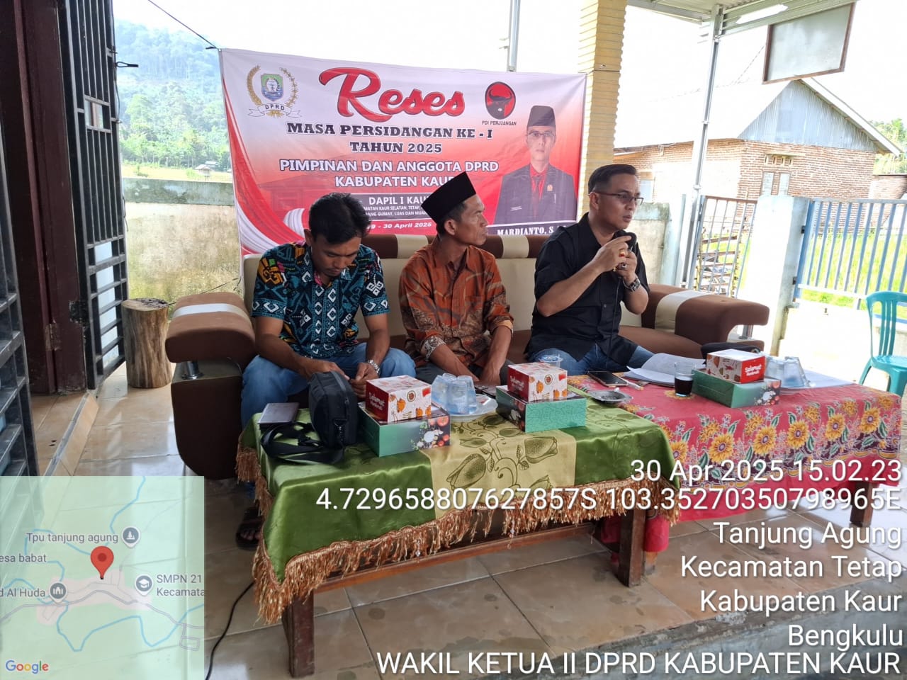 Garis-Lintas. KAUR – Warga Desa Tanjung Agung, Kecamatan Tetap, Kabupaten Kaur, menyampaikan empat usulan prioritas pembangunan saat kegiatan reses Wakil Ketua II DPRD Kabupaten Kaur, Mardianto, S.AP. Reses digelar pada Rabu, 30 April 2025, di Balai Desa Tanjung Agung dan dihadiri kepala desa beserta perangkat, tokoh masyarakat, dan puluhan warga.